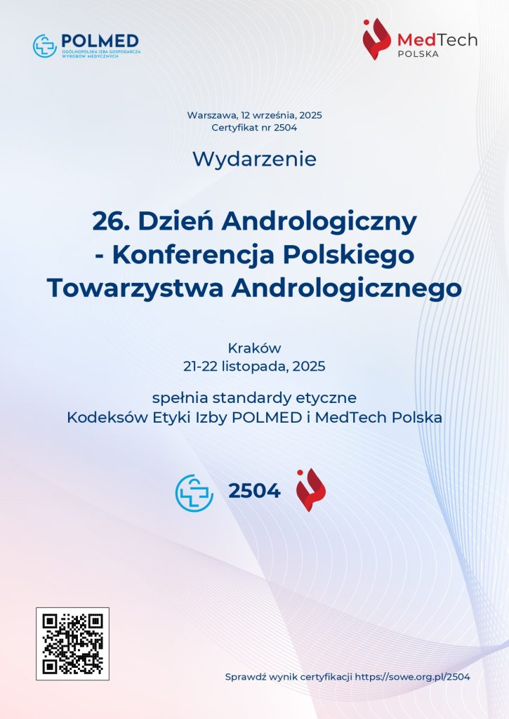 W imieniu Komitetu Organizacyjnego i Komitetu Naukowego z wielką przyjemnością pragniemy zaprosić Państwa do udziału w Konferencji Polskiego Towarzystwa Andrologicznego (PTA), która odbędzie się w ramach 26. Dnia Andrologicznego w dniach 21–22 listopada 2025 r. w Krakowie.